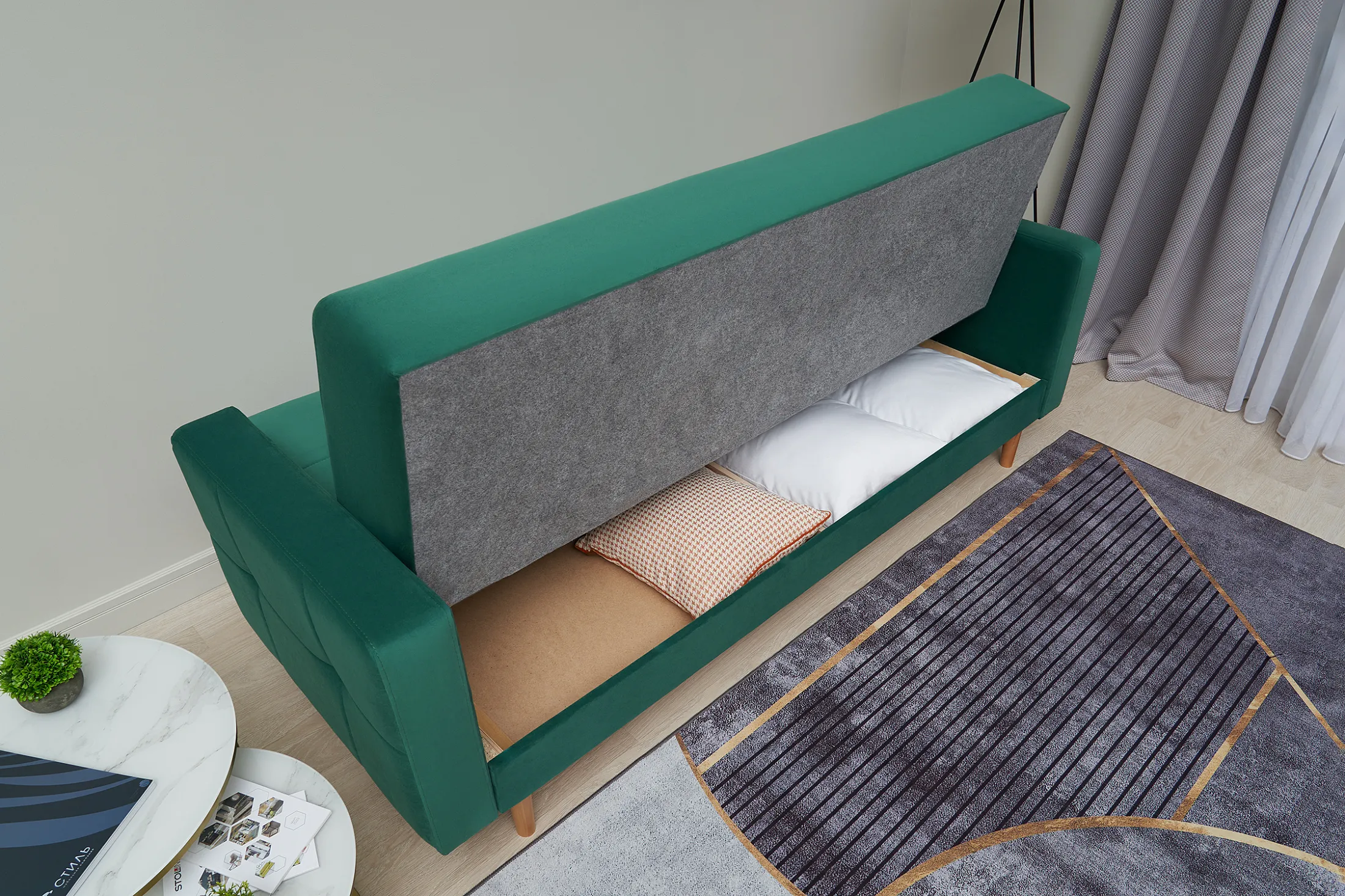 • Удобство трансформации. Механизм «книжка» позволяет быстро превратить диван в полноценное спальное место: достаточно поднять сиденье до щелчка и опустить спинку.