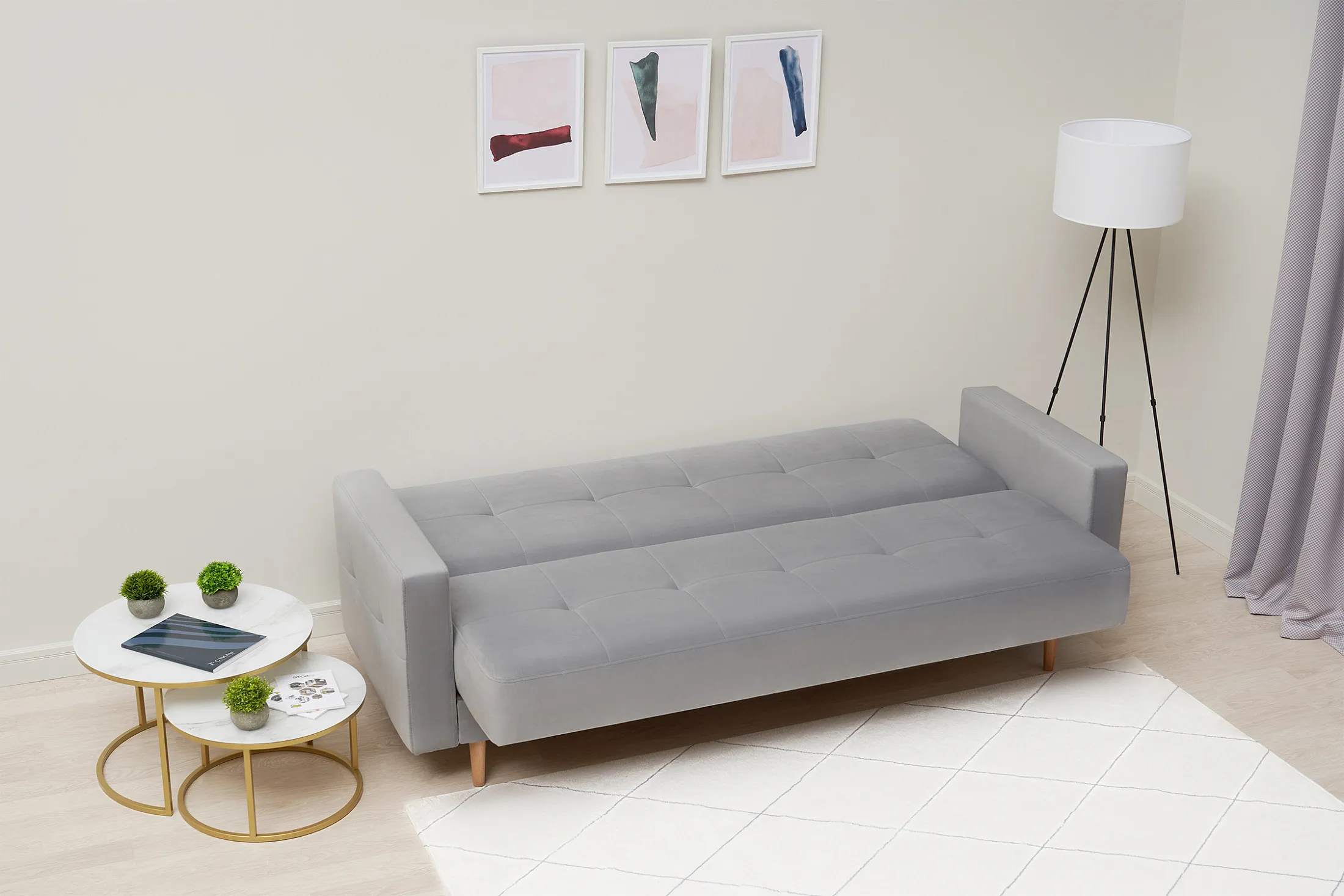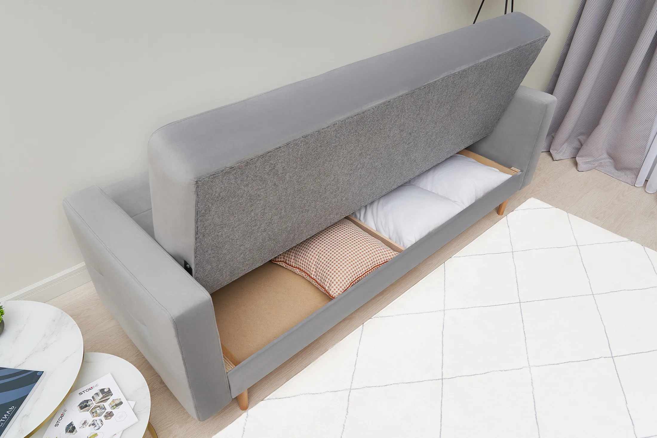 - Удобство трансформации. Механизм «книжка» позволяет быстро превратить диван в полноценное спальное место: достаточно поднять сиденье до щелчка и опустить спинку.