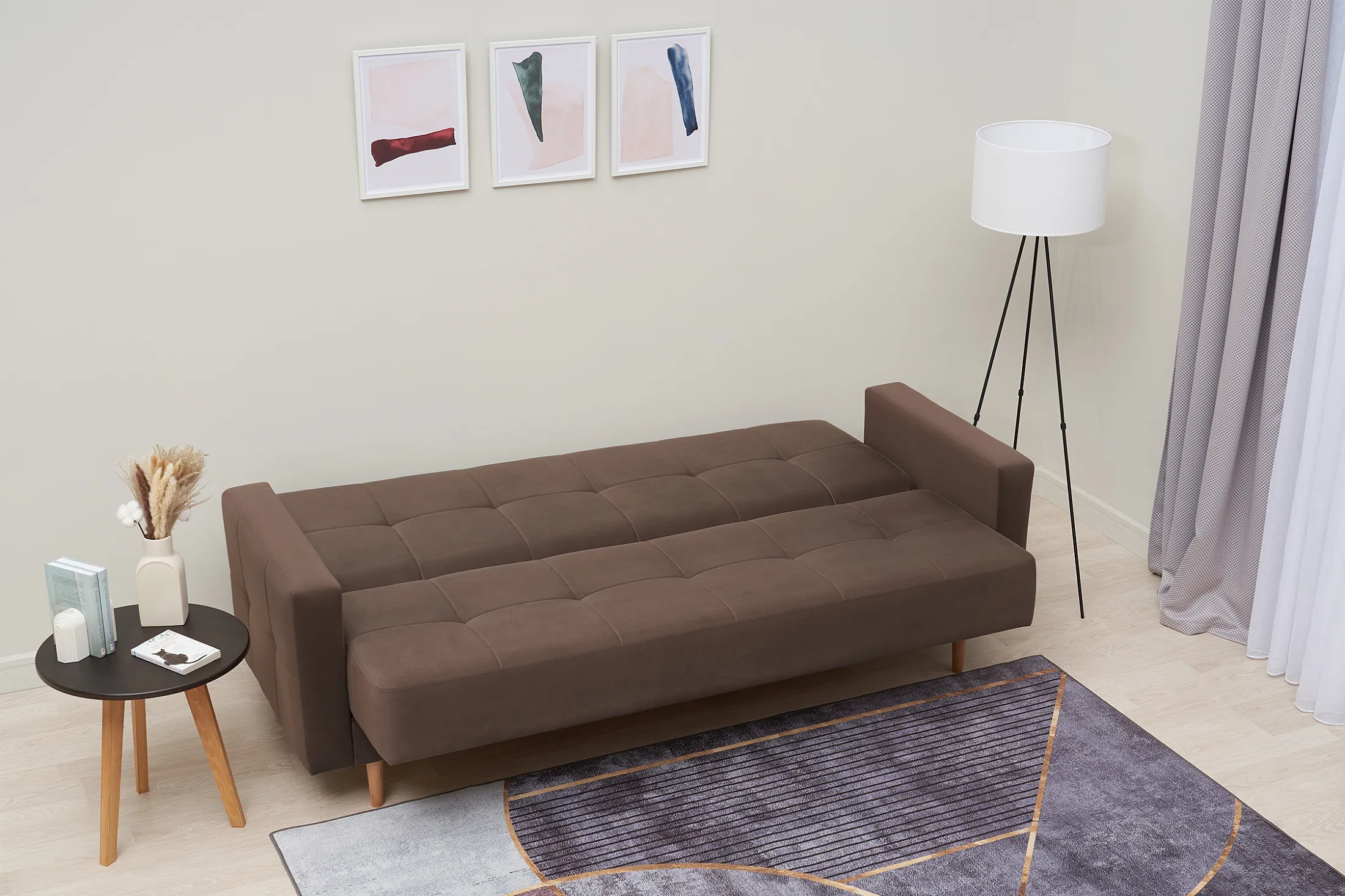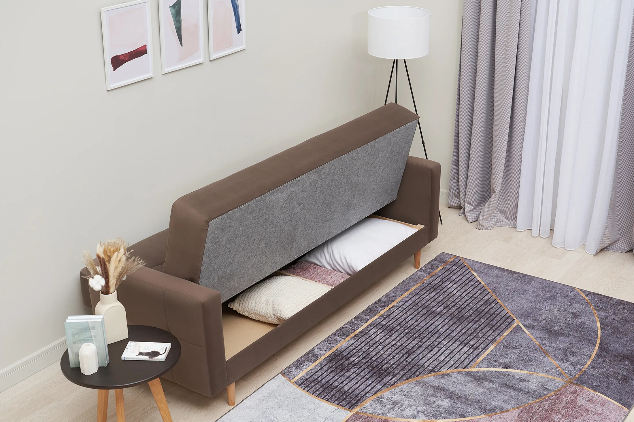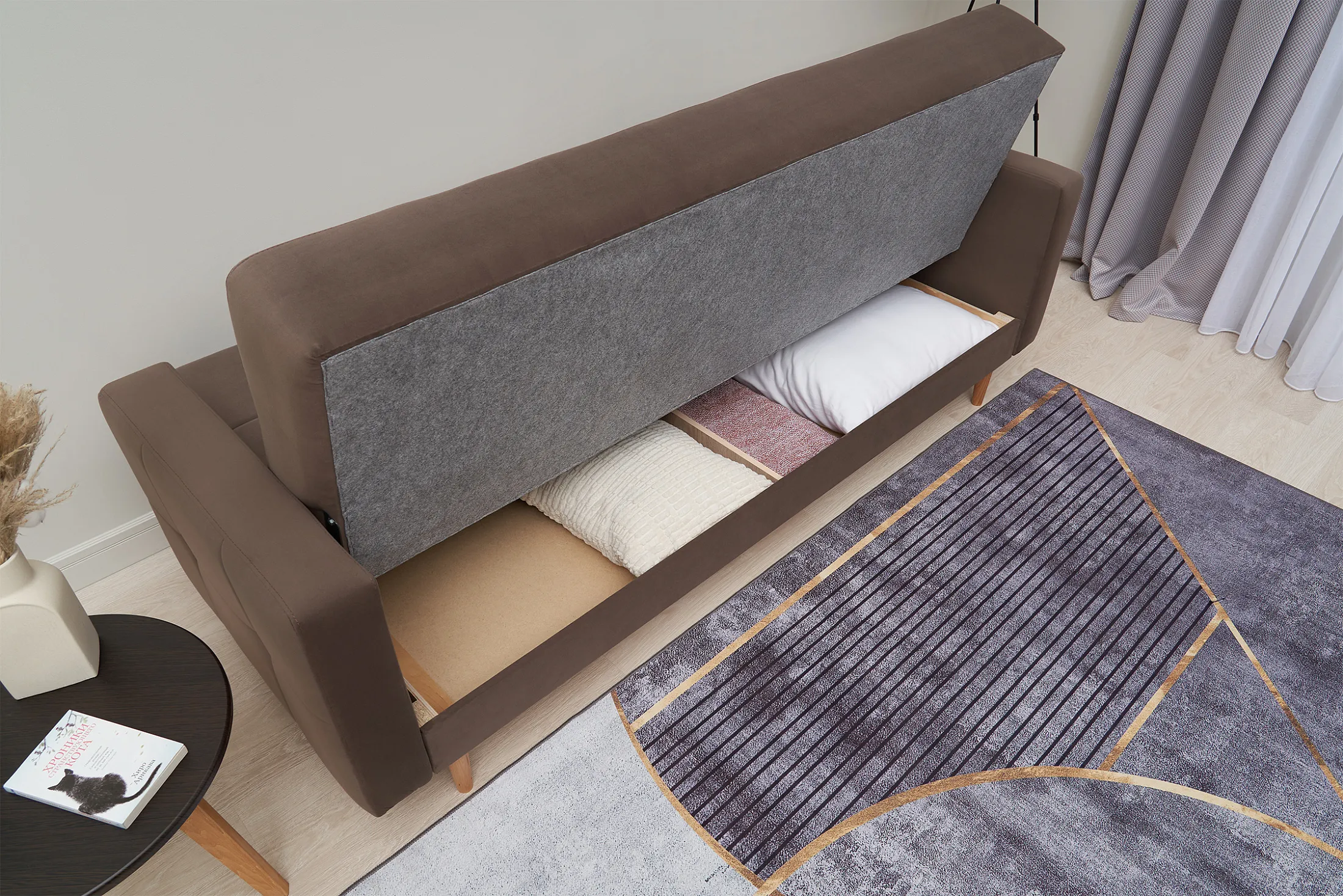 - Удобство трансформации. Механизм «книжка» позволяет быстро превратить диван в полноценное спальное место: достаточно поднять сиденье до щелчка и опустить спинку.