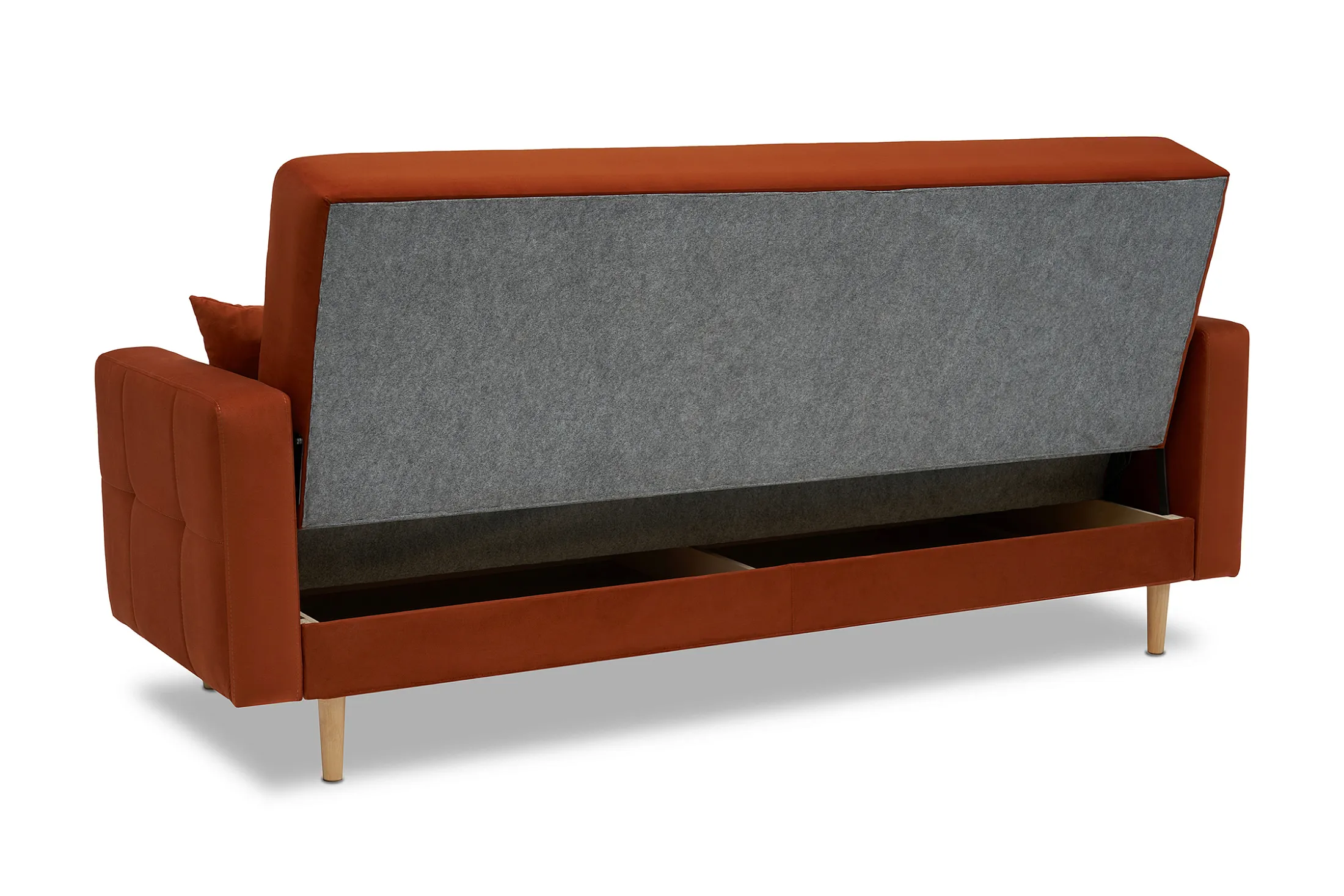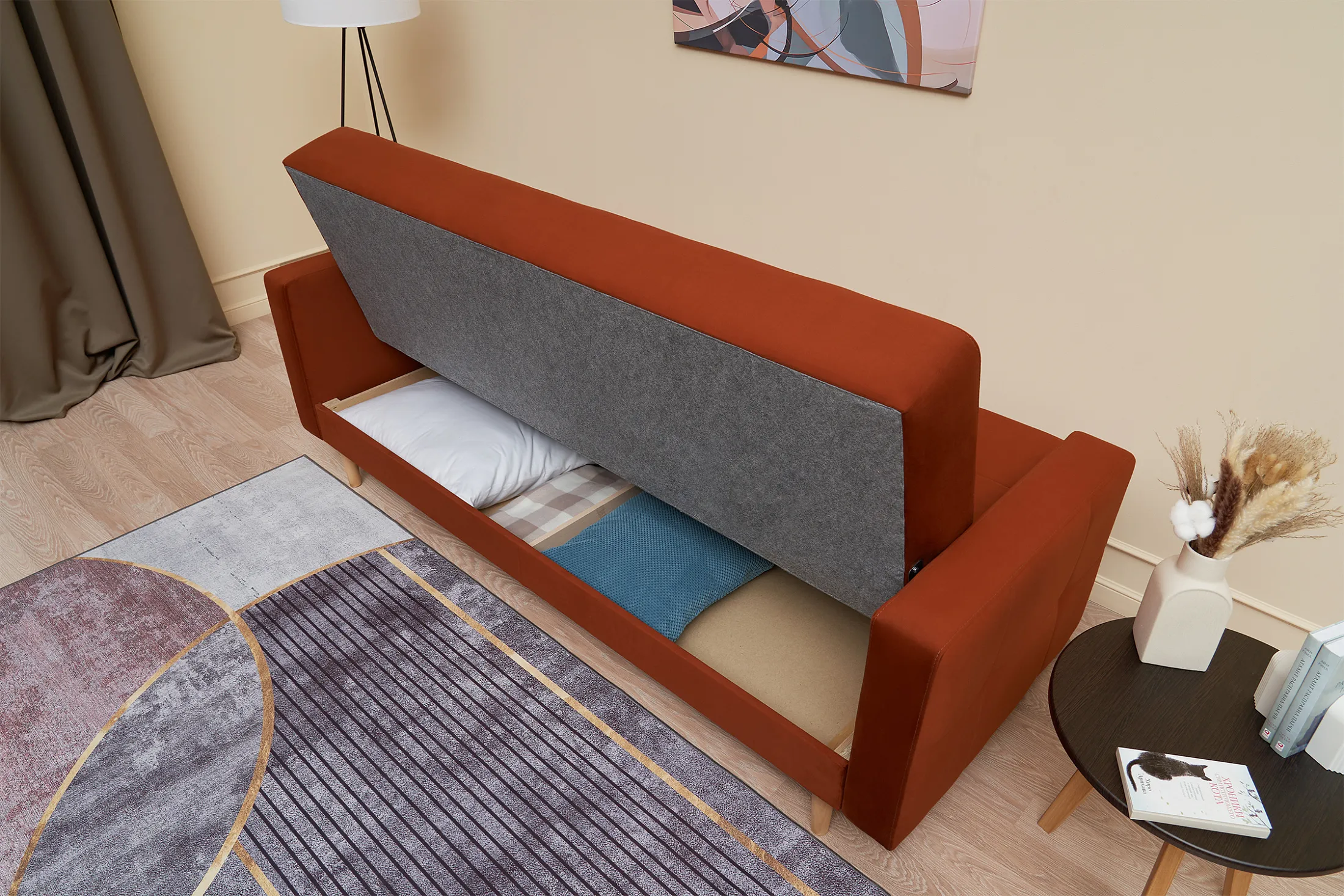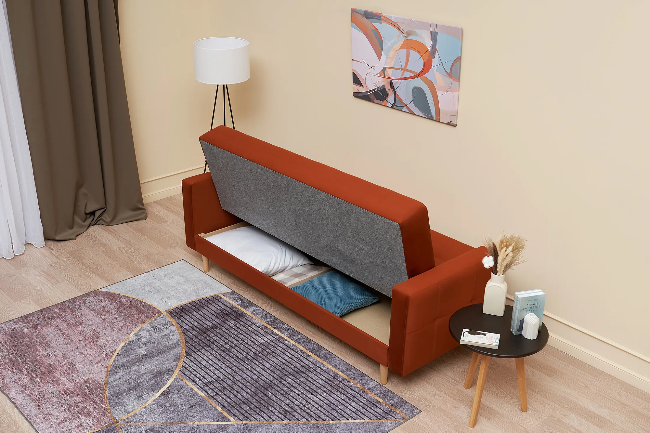 - Удобство трансформации. Механизм «книжка» позволяет быстро превратить диван в полноценное спальное место: достаточно поднять сиденье до щелчка и опустить спинку.